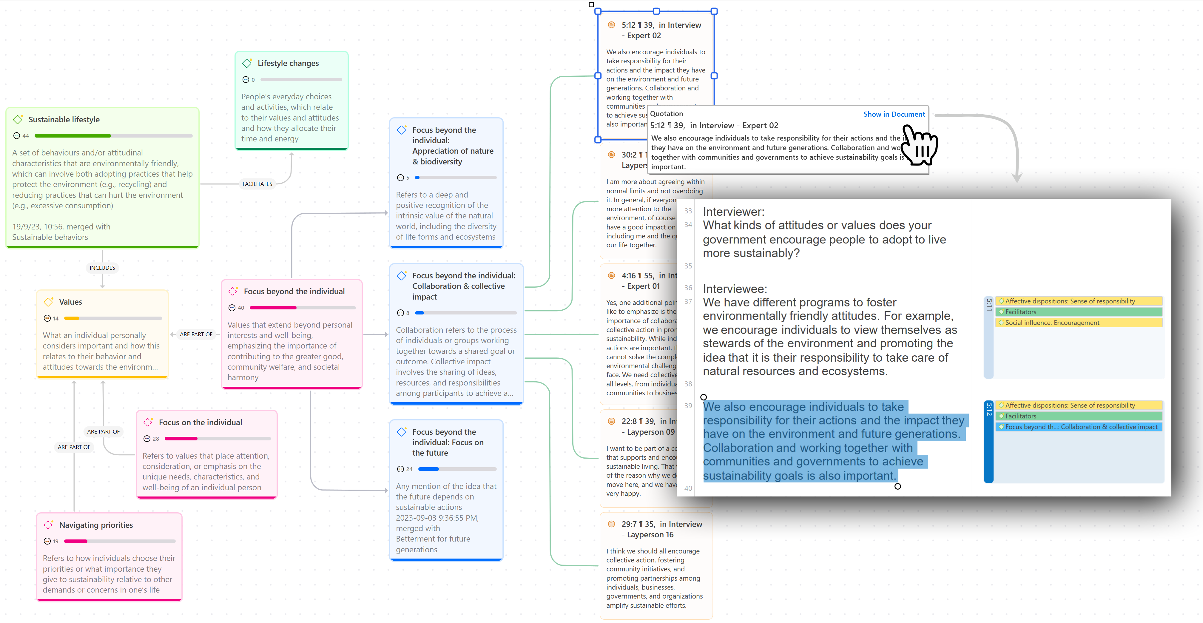 A core benefit of qualitative research software is that it maintains fluid connections between all the parts of a research project. Researchers can add codes in their documents, write notes in memos, visualize connections in networks, and more. In ATLAS.ti, all entities are dynamically interrelated and accessible to researchers. Importantly, no matter where in their project researchers are working, the data behind any part of the analysis can quickly be accessed. All data always remains embedded in its context: By simply double-clicking on a data quotation, researchers can open the original document.