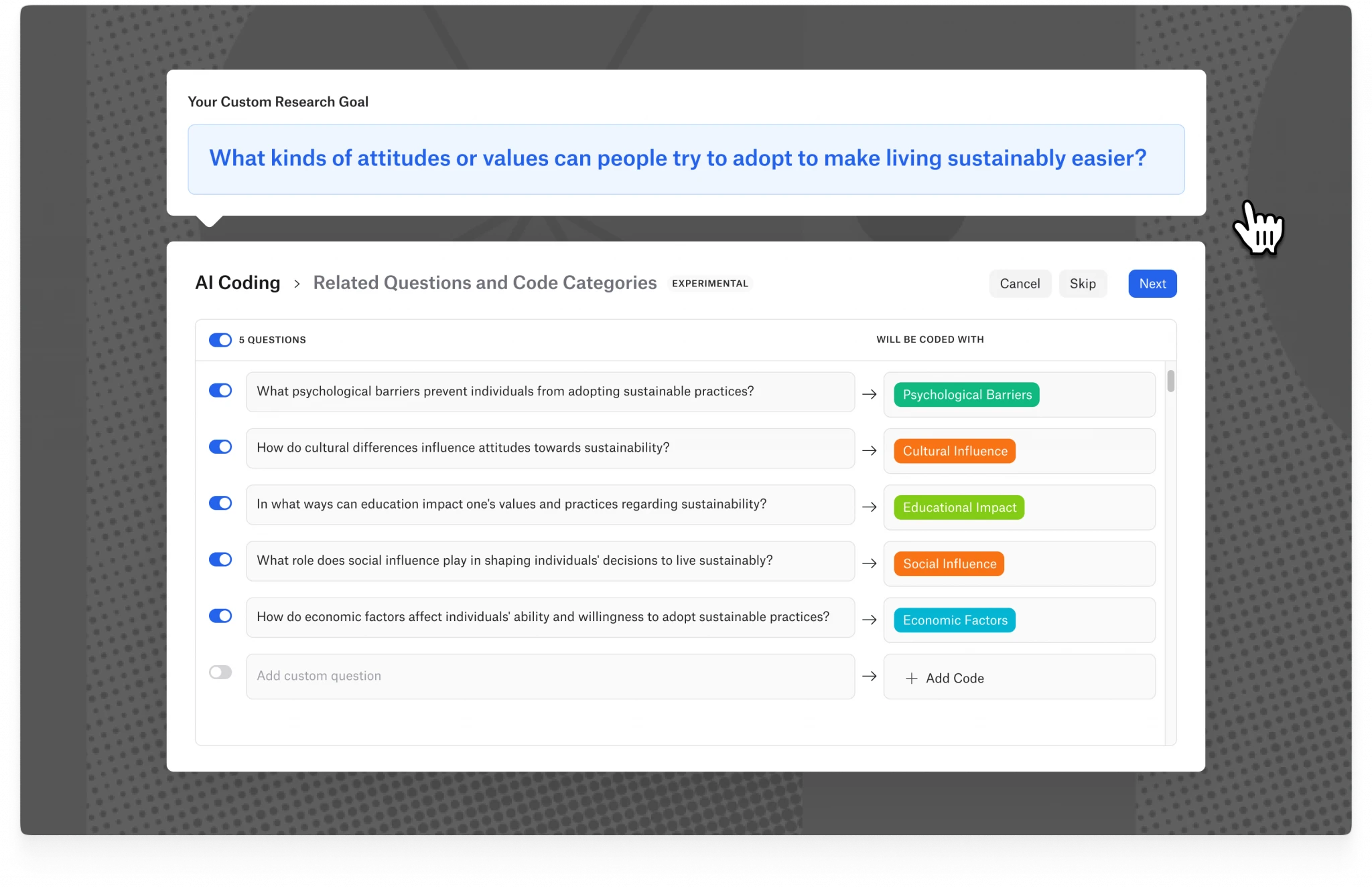 This interconnectedness makes it easy for researchers to access and review any results from AI analyses. Researchers can edit any of the results, including combining codes and updating code categories. The results can also be saved in different copies or outputs so that researchers can explore various paths in their data.