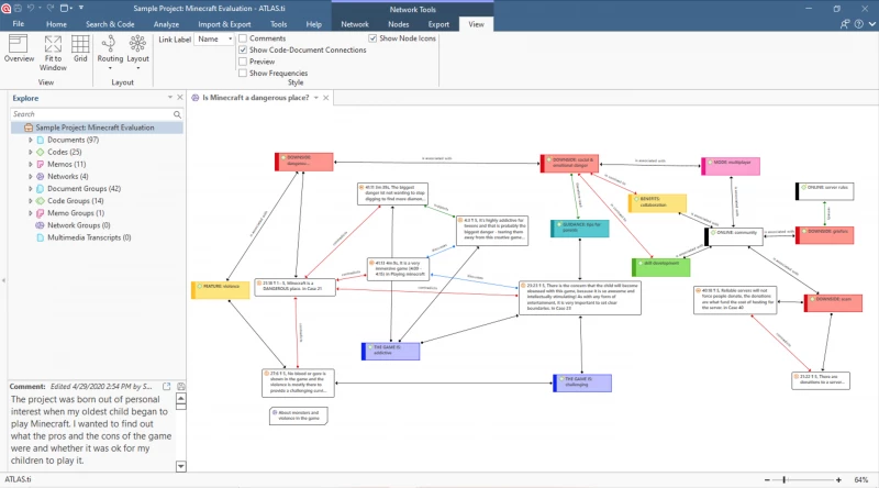Mit ATLAS.ti können Sie Inhalte aus Interviews, Fokusgruppen-Diskussionen, Umfragen, Audio, Social Media, Videos und dem Web sammeln, organisieren und analysieren. Es enthält eine verwaltete Bibliothek und eignet sich hervorragend zum Auswertung von wissenschaftlichen Daten, einschließlich Zeitreihen, Matrizen, Satelliten- oder medizinischen Bildern und multidimensionalen numerischen Rastern. Alle Daten können sowohl mit geospatialen Daten verknüpft werden. Die Anwendung ermöglicht es dem Benutzer, mit multiplen Quellen desselben Phänomens zu experimentieren und sie direkt zu vergleichen.