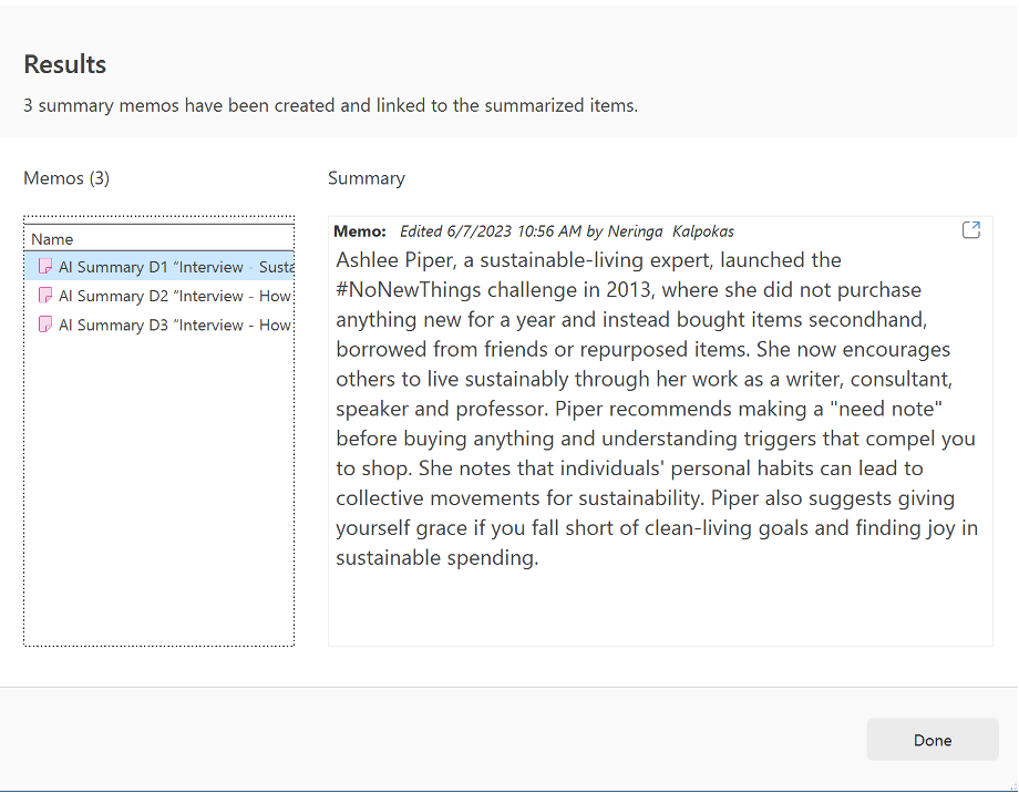 Our sustainability project contains text from three interviews on sustainability. All of this data took less than one minute for AI Summaries to process and summarize. Naturally, however, the larger your data set, the more time it will take to process. Whatever amount of time is necessary, you are free to put the AI Summaries tool in the background and perform other tasks on your project while your data is processing.