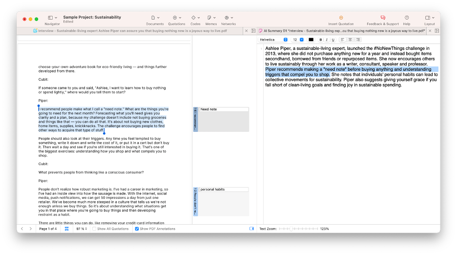 Looking at the screenshot above, you can see that AI Summaries has identified personal habits as key to sustainability. We can then apply a code to quotations that discuss personal habits to organize and view our data in one place. In the screenshot below, you can see all the data relevant to personal habits organized under one code and listed in one window.