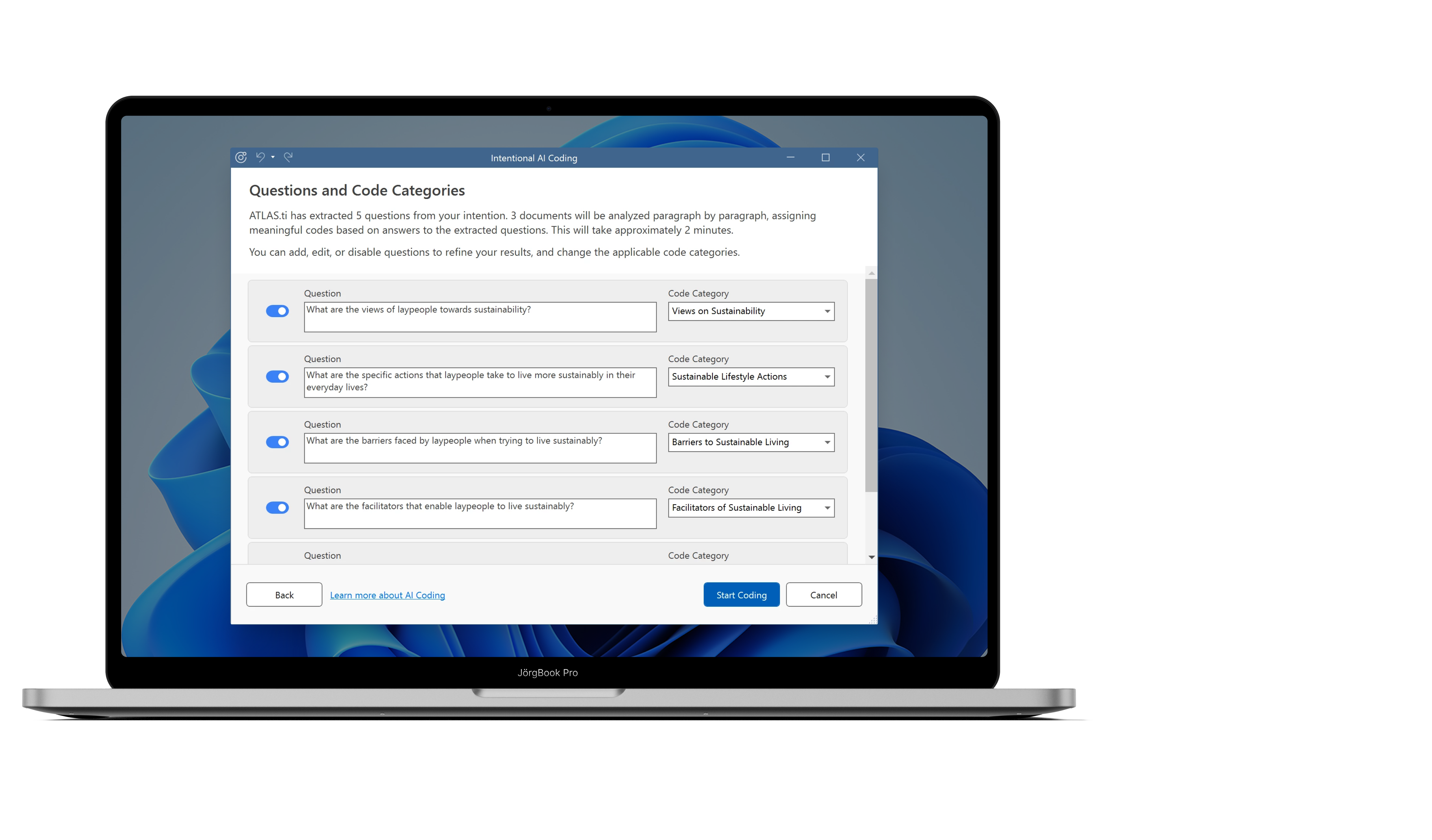 🕹️ Retain full control over AI coding – Review, refine, and customize your research questions and code categories before you apply them. The final codes remain entirely yours, keeping you as the human firmly in the loop. Ultimately, you decide.