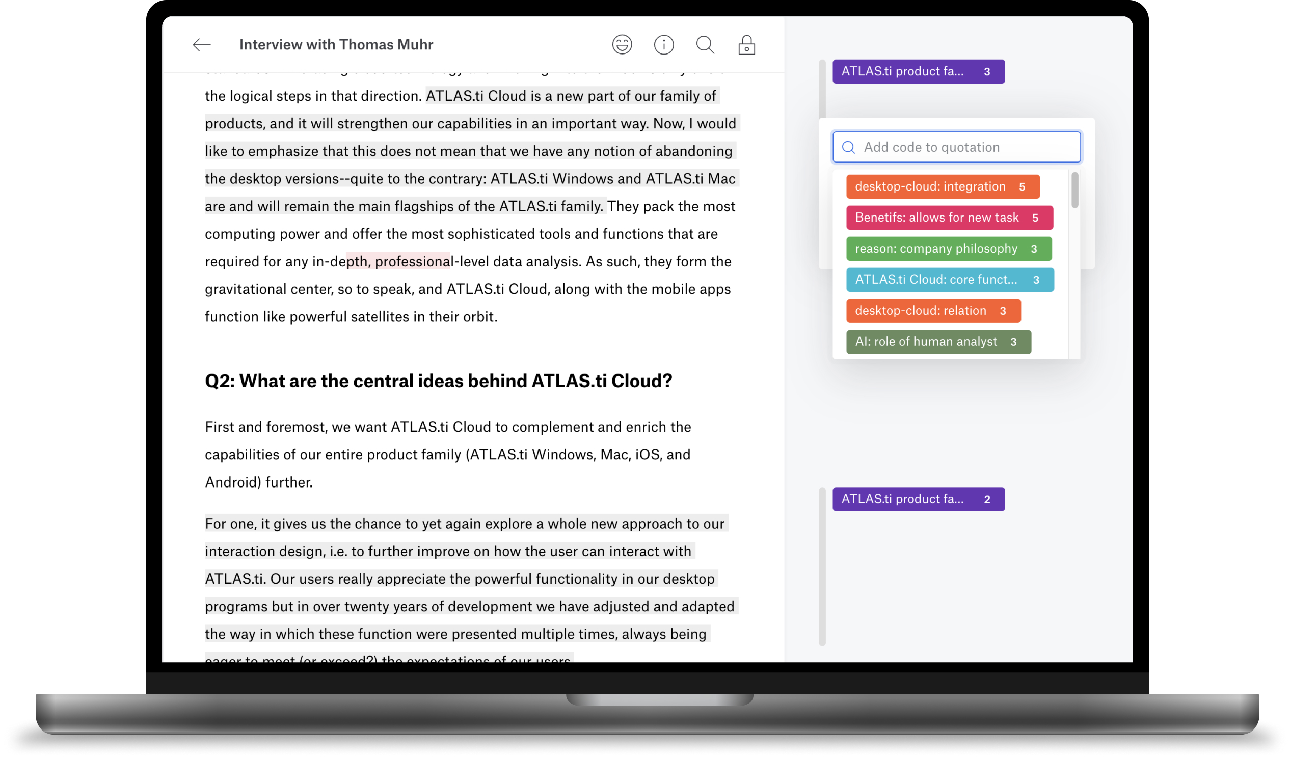 Our web-based platform enables you to analyze your data anywhere, anytime, with the power of the world's leading qualitative data analysis tools. No matter how large or complex your project, ATLAS.ti Web will help you visualize and share your findings faster than ever before.