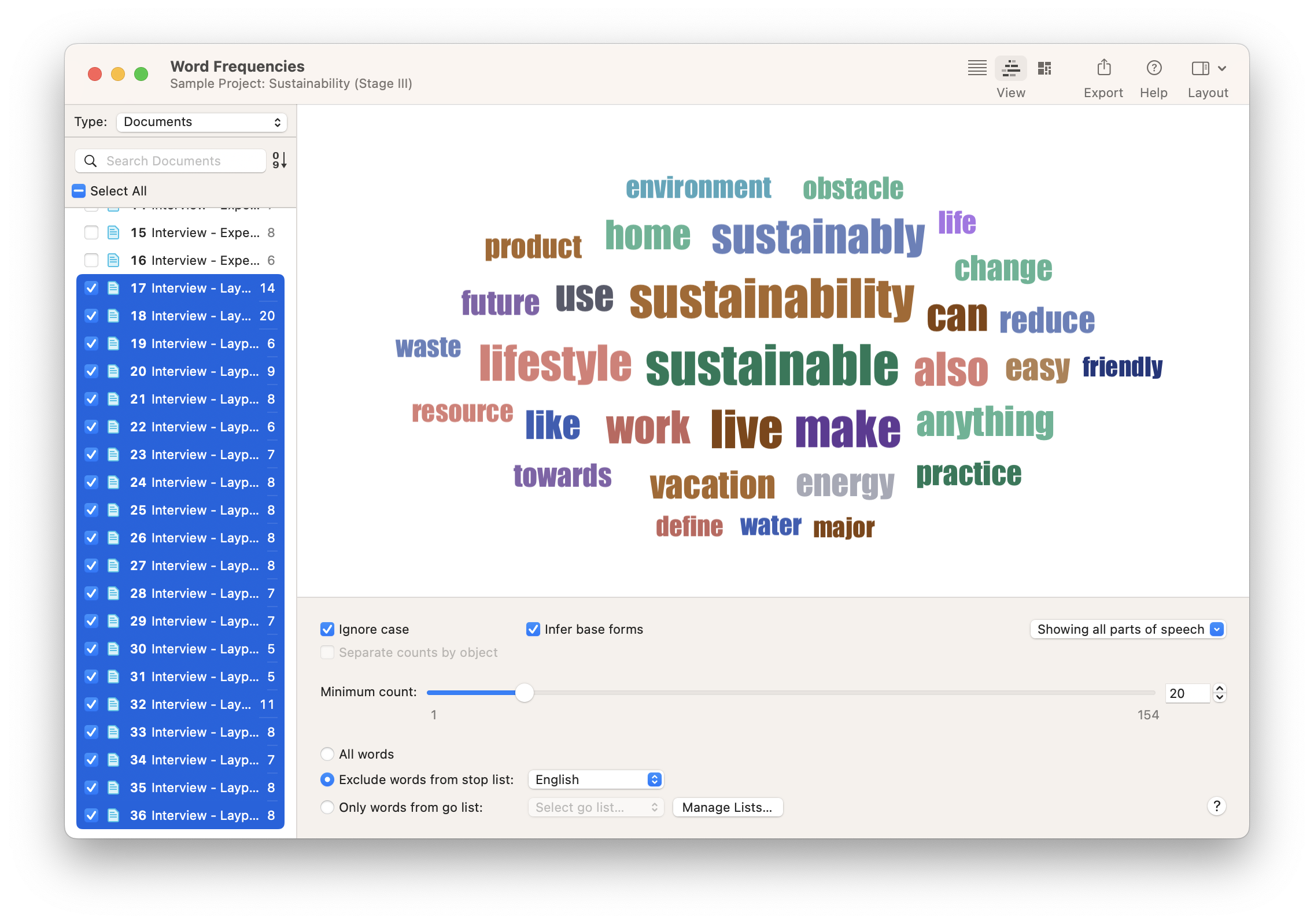 ATLAS.ti's Word Cloud tool determines the frequencies and creates the visualization quickly and easily. All the researcher needs to do is select the documents they want to analyze. They can then refine their word cloud by including or excluding certain classes of words, such as adverbs or determiners, or by setting a required minimum frequency for the word to appear in the cloud.