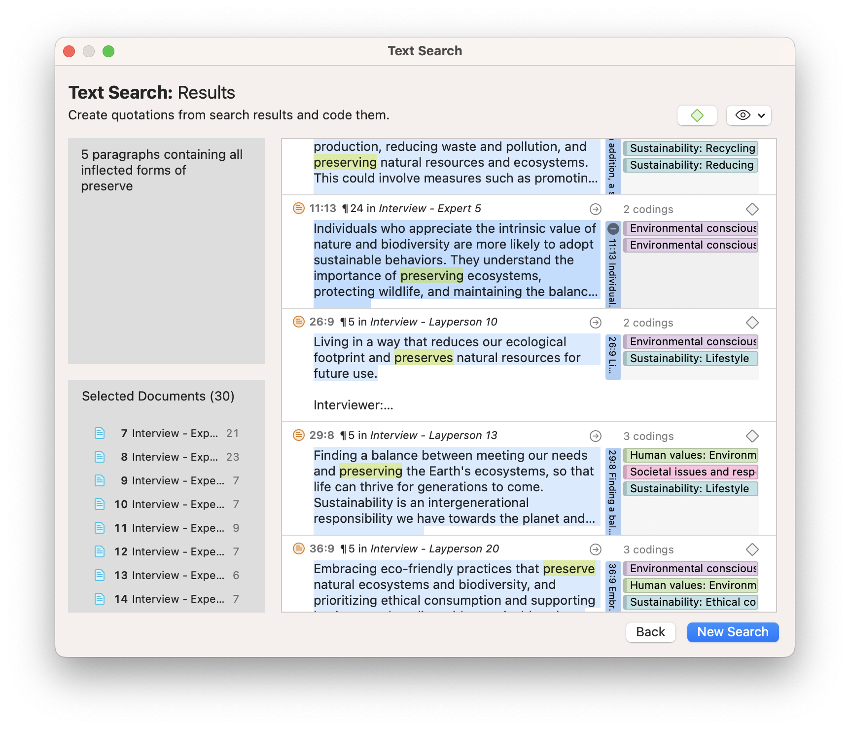 Searching for inflected forms is also important to a quantitative approach to content analysis. Given that "preserves," "preserving," and "preservation" all come from the word "preserve," it's only appropriate to include them in one search. The option in ATLAS.ti to search for inflected forms makes it easy to search the data for all possible versions of a word. And in Text Search, all results can be easily coded so those codes can be used in content analysis.