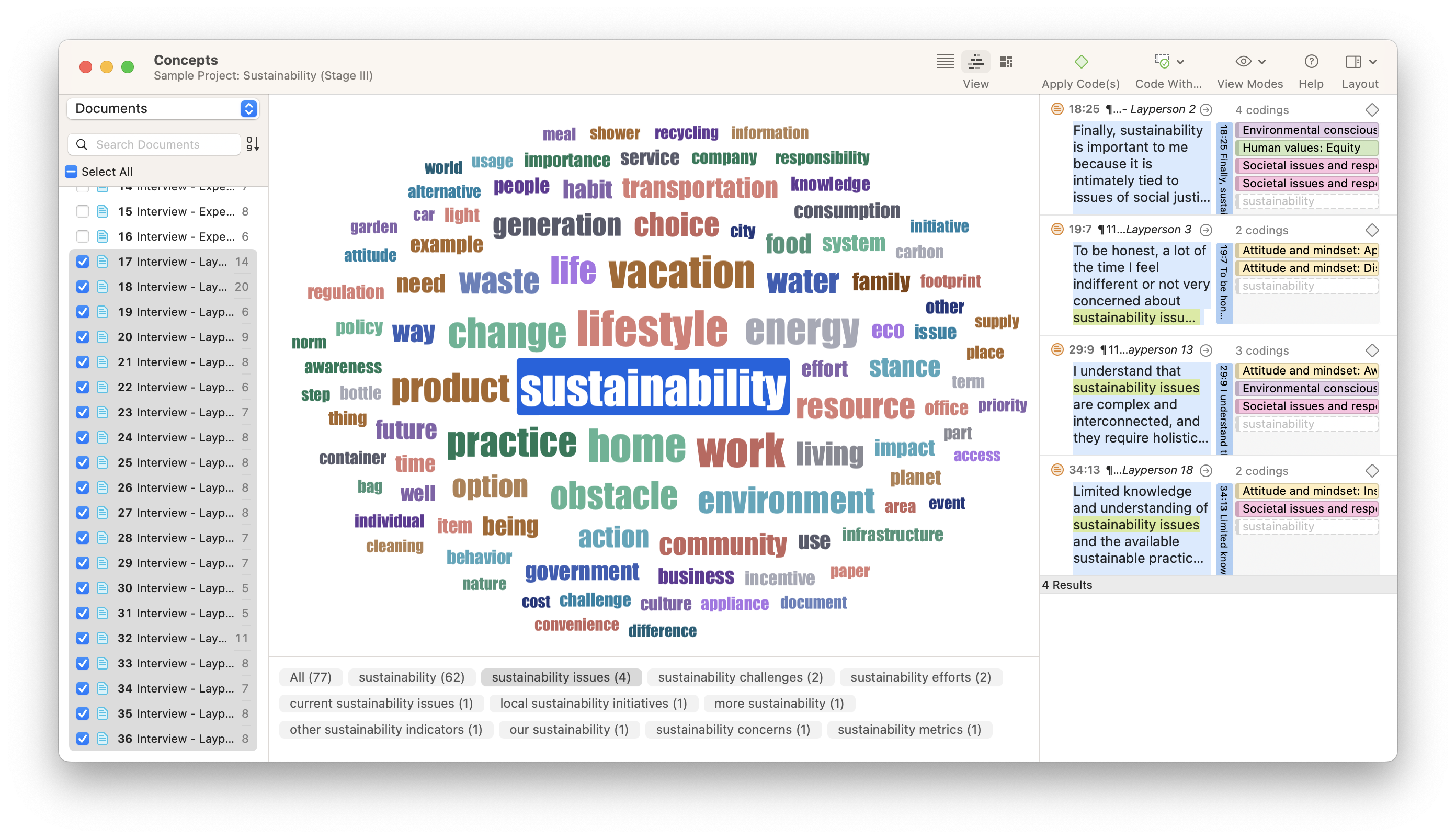 Once the researcher selects the data they want to analyze, the words included in the most common concepts will appear in a visualization resembling a word cloud. Hovering over any of these words will show which phrases are relevant to that word and where those phrases can be found in the data. This allows the researcher to look at the phrase in context and add codes as necessary.