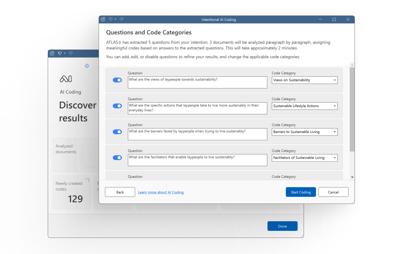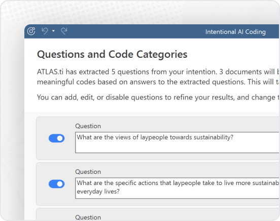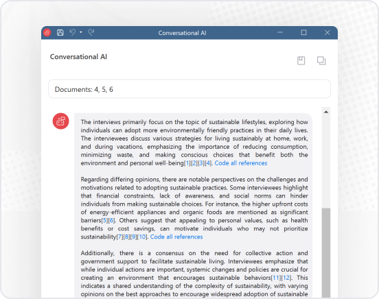 Transformar datos basados en texto en información valiosa puede llevar mucho tiempo. Con ATLAS.ti, puede importar datos de cualquier fuente y obtener información más profunda utilizando IA. Nuestro software cualitativo ofrece herramientas para crear automáticamente segmentos codificados en sus datos e identificar temas rápidamente.