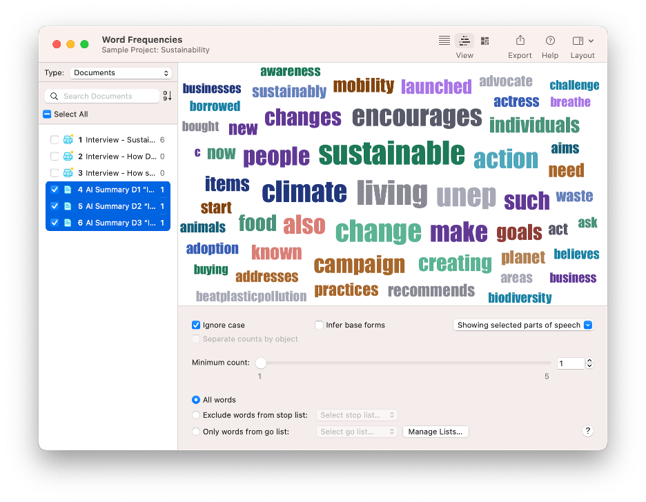The Word Frequencies tool in ATLAS.ti is great for conducting content analyses of your data. However, word counts on a full body of information might include words that are not pertinent to your analysis. For example, think about a transcript, where the names of speakers appear multiple times. Imagine a research article where the text of the headers and footers are repeated on every page. Counting these words might interfere with the frequencies used to represent your themes.