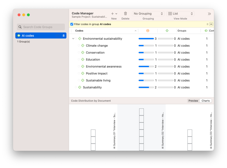 AI Coding, when used with AI Summaries, affirms that environmental sustainability is the overarching theme in each interview. Each of the three interviews in this project looks at sustainability from different angles such as climate change, conservation, and environmental awareness. This is useful because, if your research inquiry is focused on a specific strand of environmental sustainability, then you can focus only on the documents whose summaries are coded with that specific strand.
