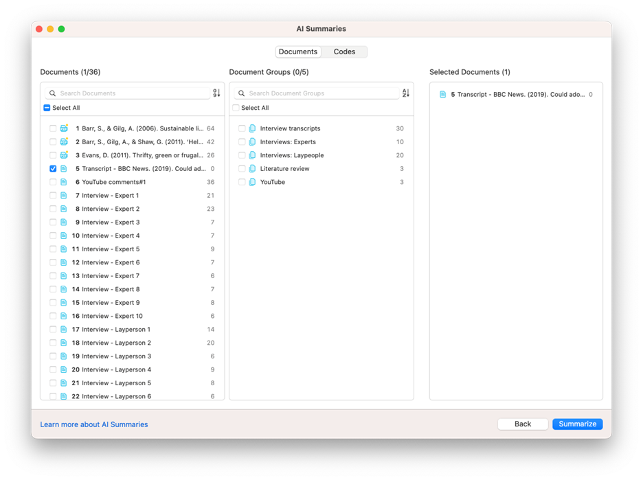 Finding ways to reduce your qualitative data can prove especially beneficial to those conducting literature reviews or document analysis. When you have dozens or hundreds of documents and need to get a bird’s-eye view of the themes and patterns in your data, AI Summaries can be a valuable research assistant that can help you with synthesizing knowledge across your entire project.
