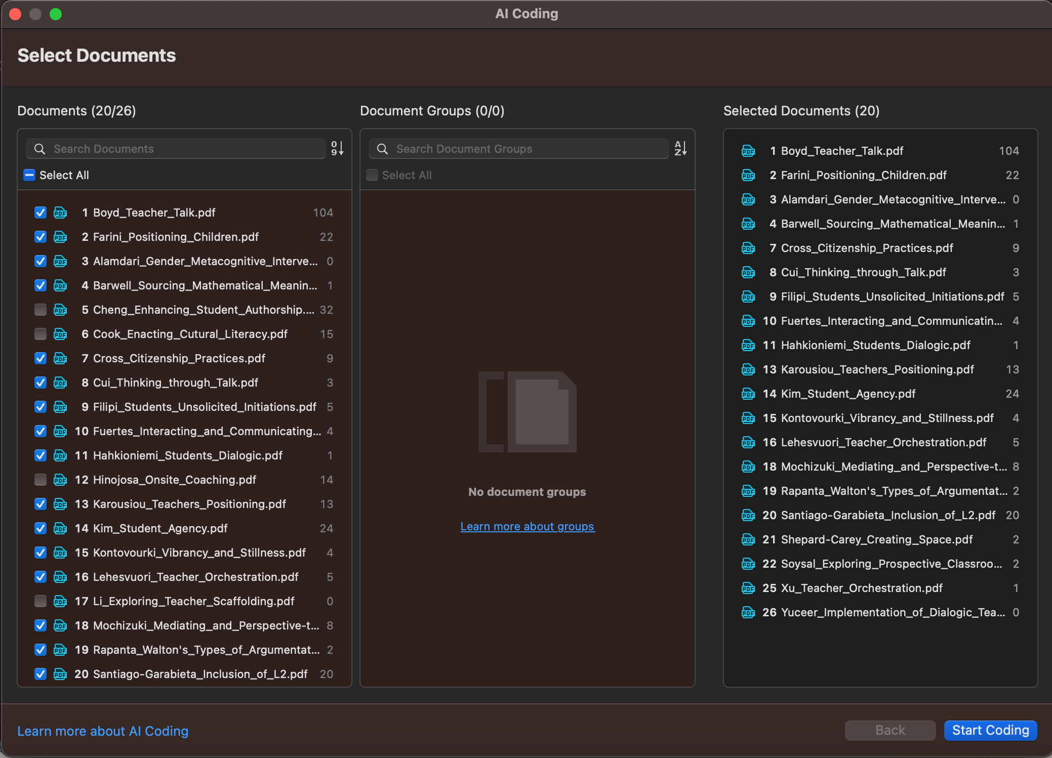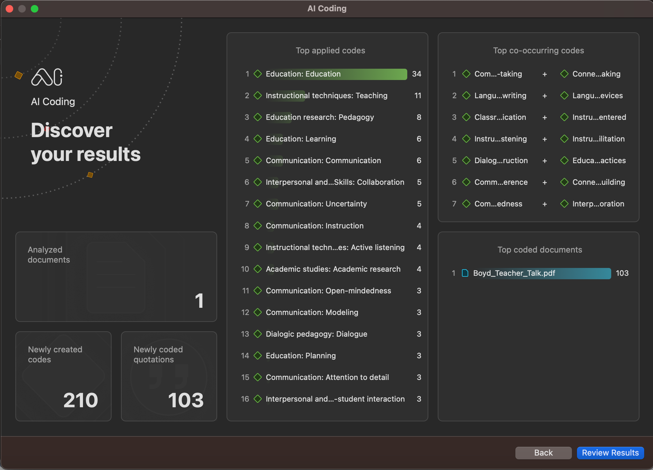 The AI Coding tool promises to be easy to apply to all text data in your project. In ATLAS.ti, all you need to do is select the documents where you would like to automate the coding process. The data is processed online through OpenAI's servers where AI analytics examine the data and make informed predictions about what codes should be applied and where. A dialogue appears with a set of codes proposed by AI analytics for you to review.