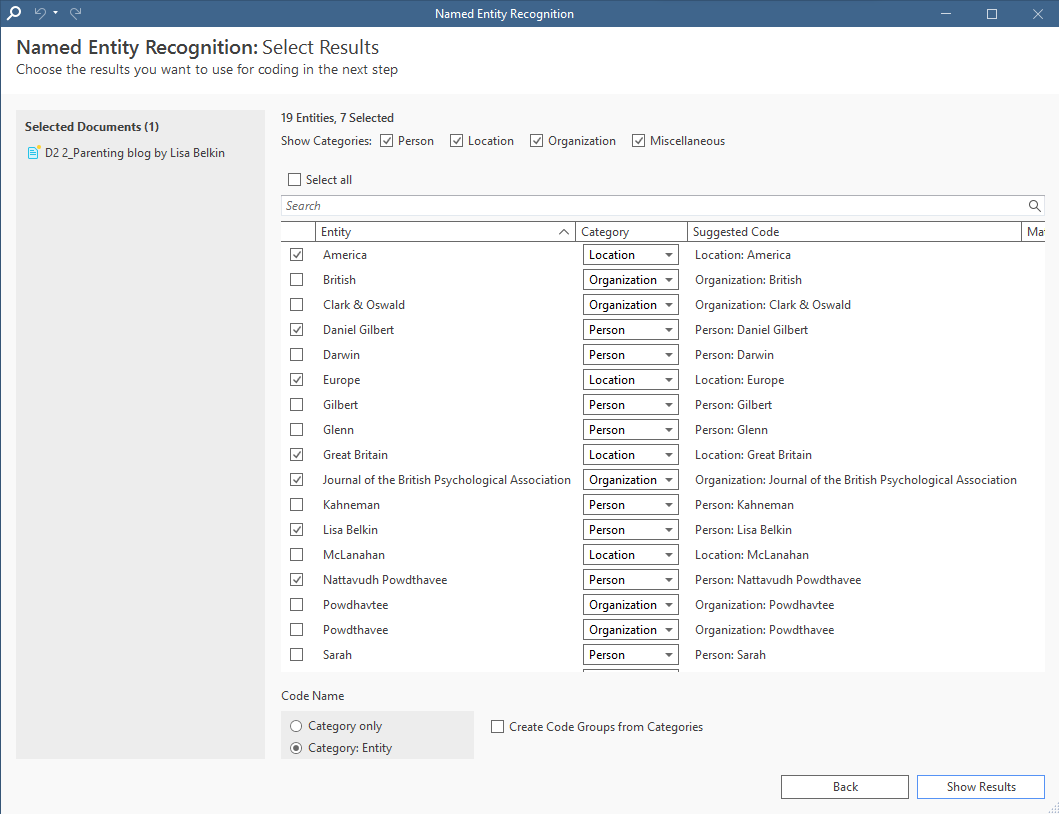 Machine learning capabilities in Named Entity Recognition can identify the names of places, people, or groups and can suggest codes for data segments that mention these names. After that, the Co-Occurrence Analysis tool can cross-tabulate these codes with your sentiment codes to identify the nature of the sentiments expressed in the data that explores a particular named entity.