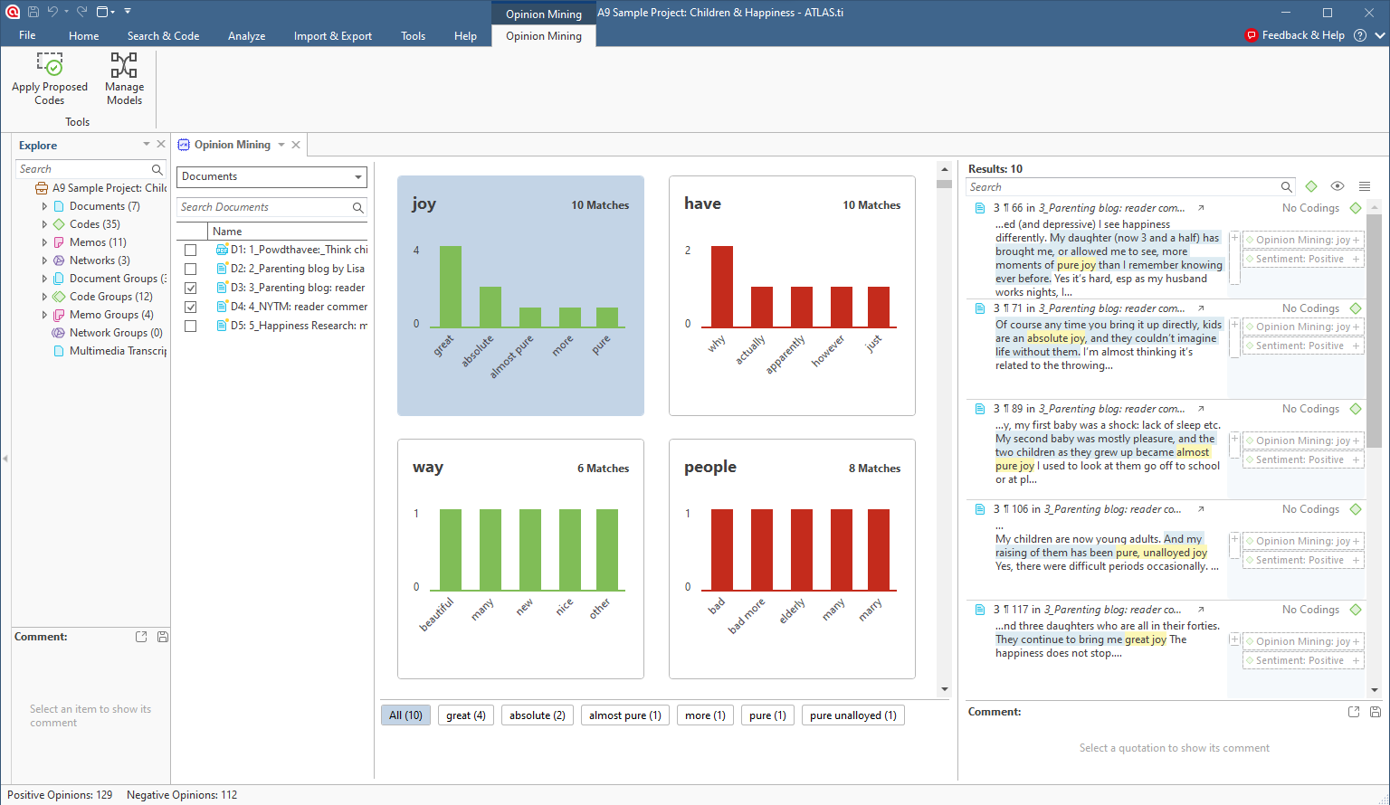 As an extension of Sentiment Analysis and Concepts, the Opinion Mining tool can automate the process of producing insightful visualizations based on an interpretive analysis of the data. The Opinion Mining tool can identify commonly used words in key phrases, visualize descriptive statistics of the words associated with each term, and propose sentiment and opinion codes for all relevant quotations. This makes it easy to understand not only what is being talked about in your data but also how people feel about that specific thing.