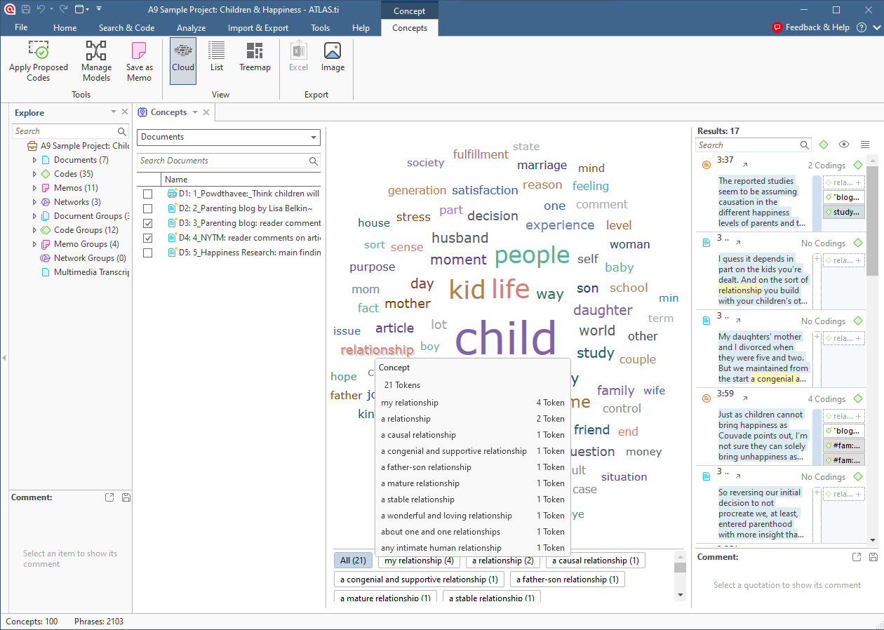 The Concepts tool is a good starting point when processing a set of social media data or interview transcripts. Using this tool, a descriptive analysis can seek out phrases that people use when discussing happiness and raising children. Codes applied to those phrases through Concepts can be grouped together using category codes, smart codes, and/or code groups to gather a sense of the larger themes apparently relevant to the topic of happiness.