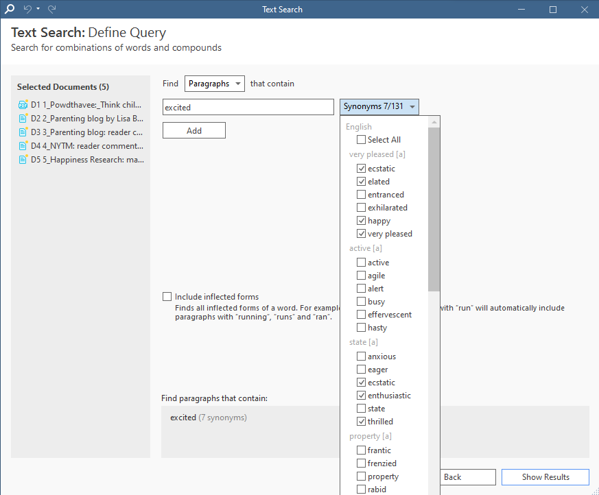 However, the AI aspect of Text Search lies in its ability to look for synonyms and inflected forms of a word. ATLAS.ti can suggest a list of possible synonyms that might provide the same meaning you're looking for and search for different forms of the same word (e.g., "happy" and "happiness"). The expanded search capability can help you identify more relevant segments of data quickly and with less effort.