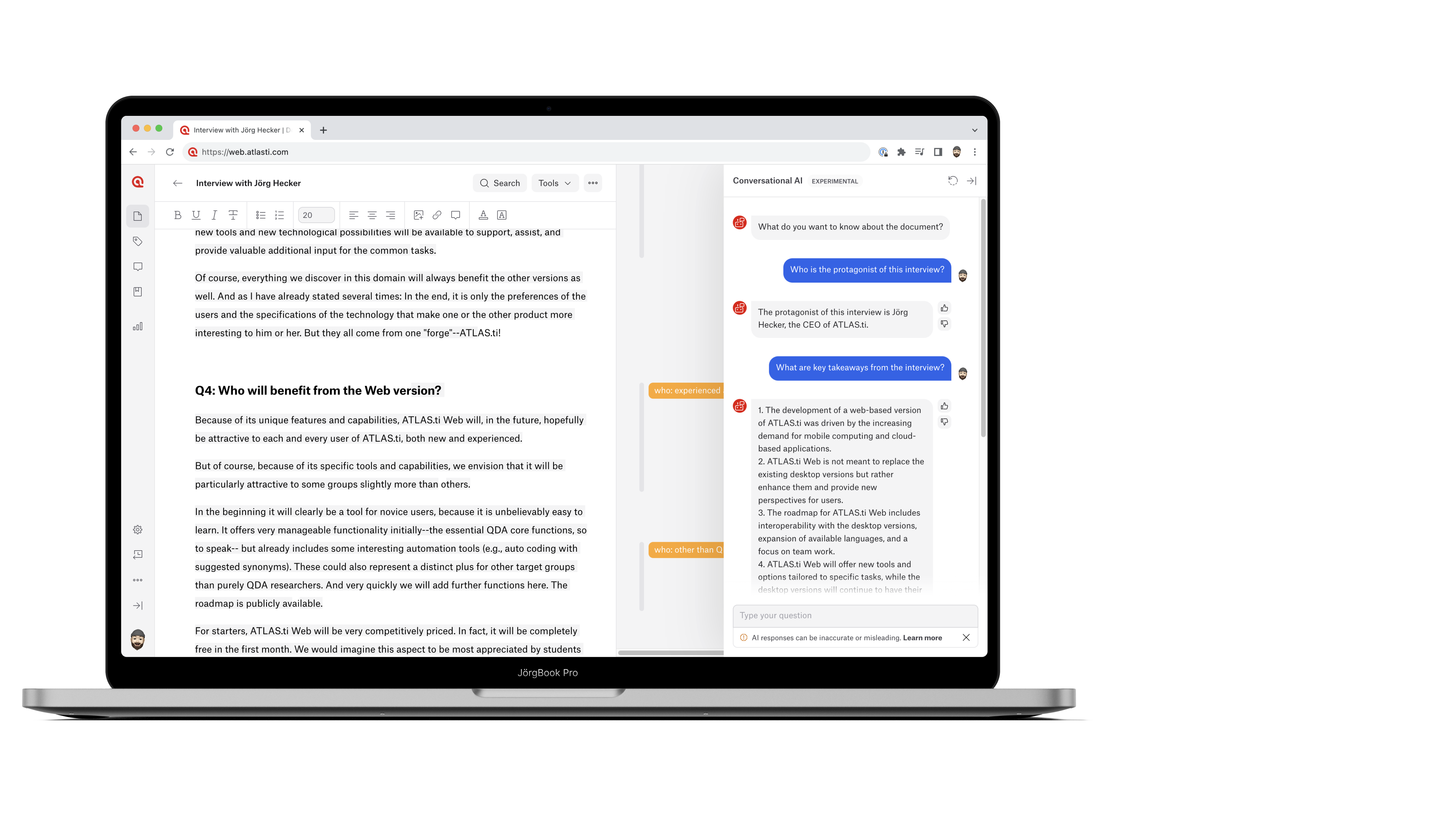 Transform your data analysis with our enhanced Conversational AI feature in ATLAS.ti Web. Engage in natural conversation to explore, clarify, and distill key insights from your documents.