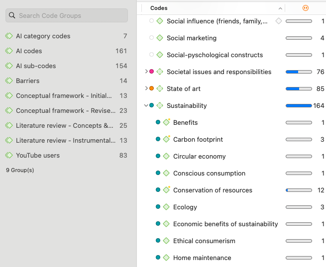 In terms of coding, ATLAS.ti gives you the flexibility to choose the extent to which AI codes your data, whether you want your entire data set coded to suit your research inquiry or you just need a little inspiration during the coding process. Users of ATLAS.ti can code a discrete data segment with AI Suggested Codes or entire documents with AI Coding or Intentional AI Coding, both of which also create a coding structure complete with category codes and sub-codes to keep your codes organized and manageable. In contrast, MAXQDA's AI capabilities can only code one segment of data at a time, rather than entire documents, and can only suggest sub-codes of already existing codes.