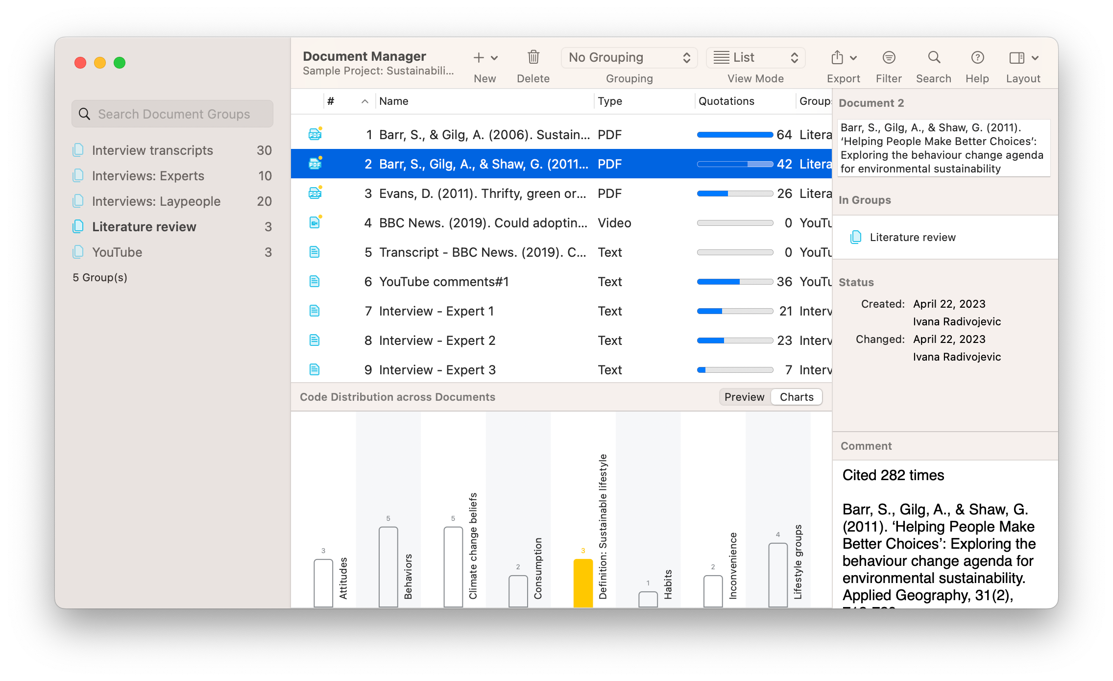 ATLAS.ti excels in data organization with an intuitive Document Manager, allowing you to sort documents by multiple categories represented by document groups. Document groups provide a level of flexibility not seen in MAXQDA, which provides a traditional file system for documents that might limit the organization of data if your documents simultaneously belong to multiple categories or analyses.