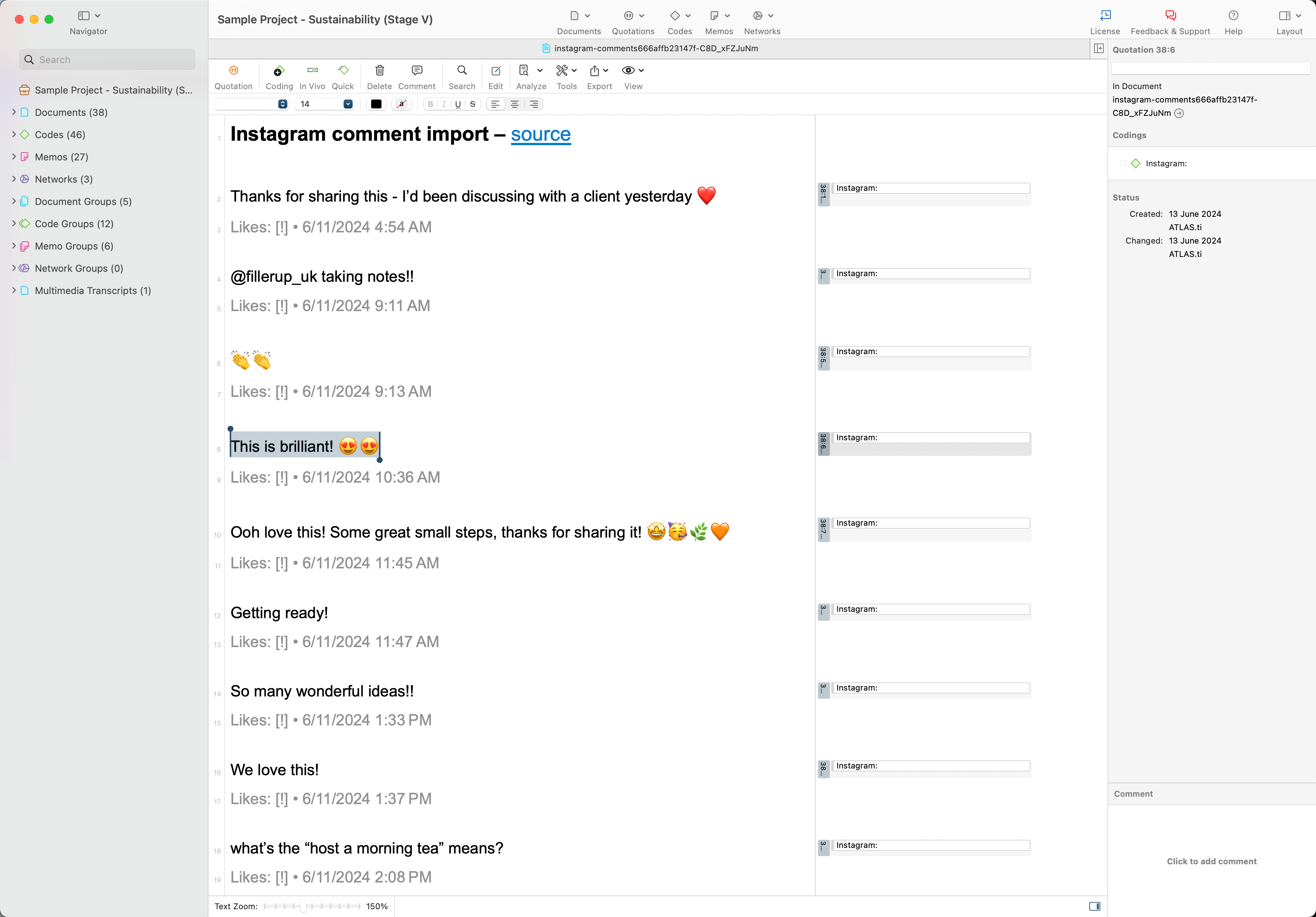 Social media research is also more flexible in ATLAS.ti. MAXQDA only allows users to import Tweets from Twitter/X, limiting researchers who want to analyze trends in social media. On the other hand, researchers can import data from any social media post, such as comments from YouTube videos, TikTok posts, Instagram posts, and more into any ATLAS.ti project.