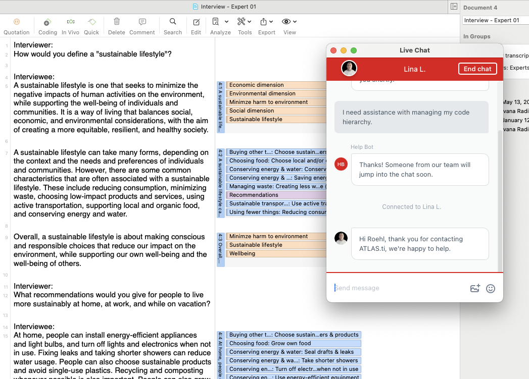 In ATLAS.ti, manual coding is simply a matter of highlighting text and choosing from existing codes or creating new ones to apply to the data. A pop-up window that displays your code list near your text makes the coding process quick and easy. Quick Coding allows users to apply the most recently used code to any data segment with just a few clicks, while the Code In Vivo option creates codes directly from the text.