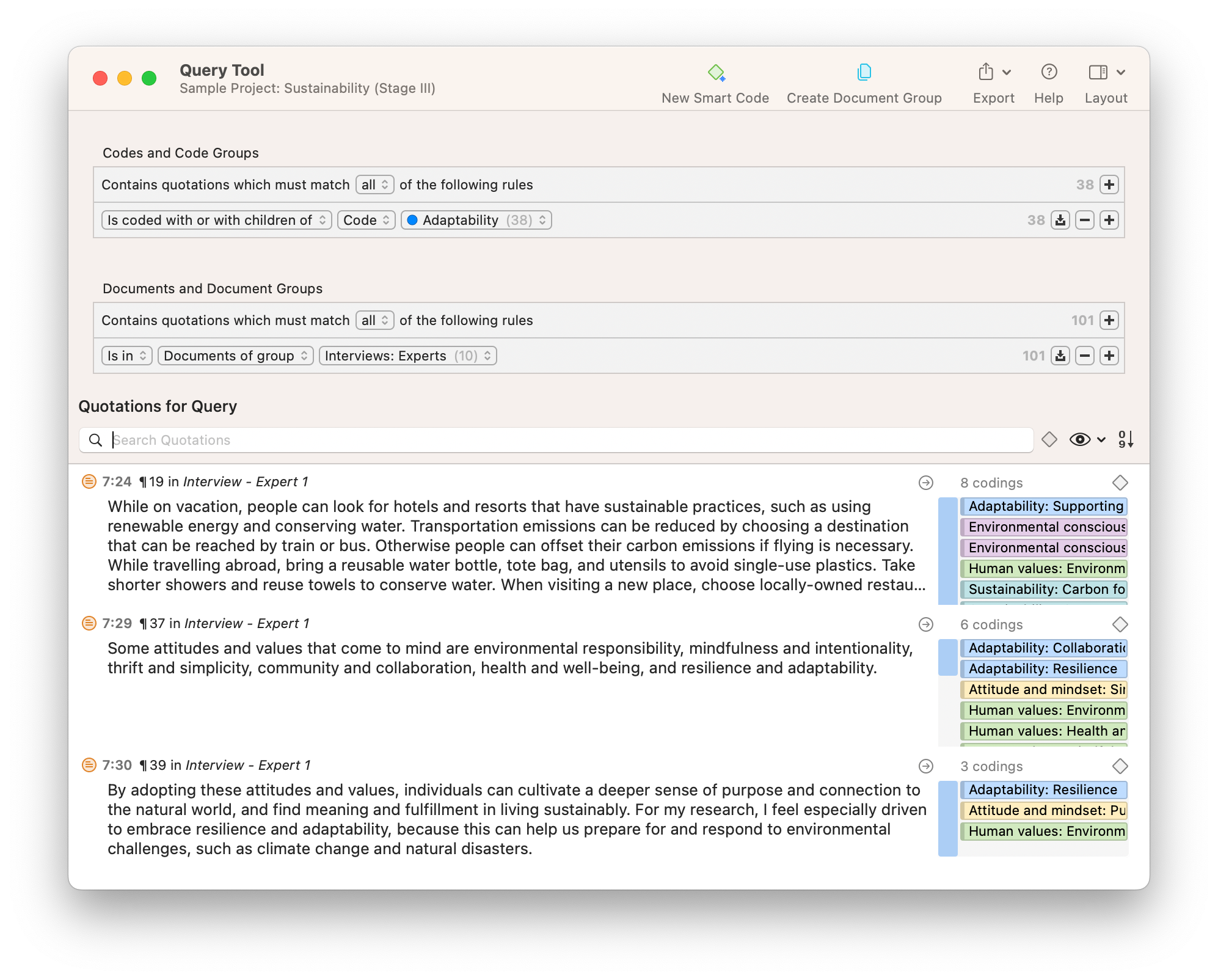 The Query Tool can easily find patterns in the data, no matter in what document the insights are located. In one interface, users in ATLAS.ti can construct detailed queries of their coded data in a manner that may require the use of multiple tools in MAXQDA. Instead of conducting multiple and sequential analyses in MAXQDA's Code Explorer or Complex Coding Query, ATLAS.ti's Query Tool can accommodate multiple criteria for codes with any combination of Boolean and proximity operators that suit your research inquiry.