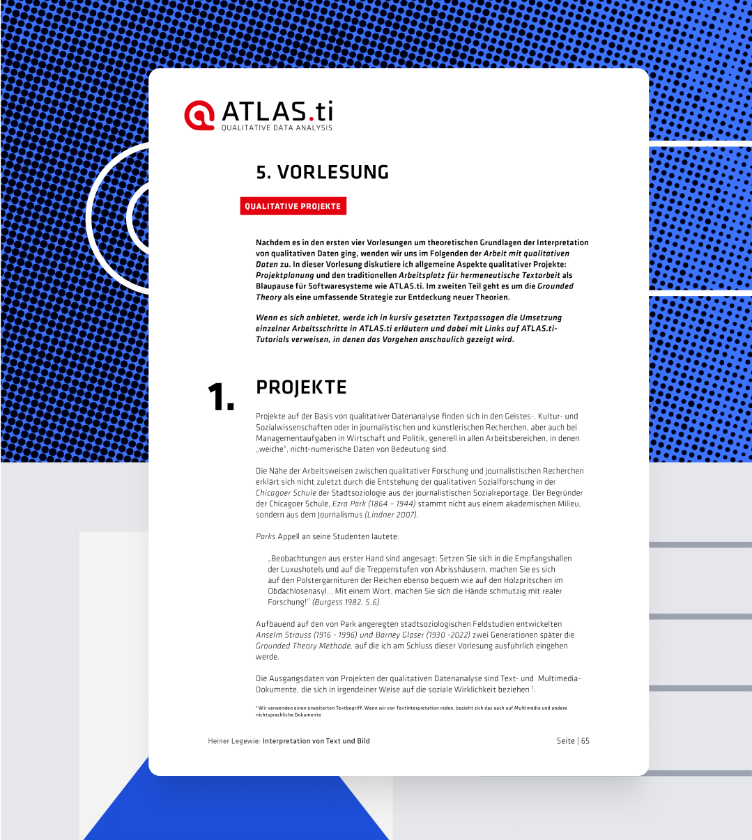 Einen besonderen Platz nimmt die fünfte Vorlesung ein. Hier wird die „Philosophie“ qualitativer Projekte beschrieben, es geht um die Logik und Strategie der Entdeckung neuer Erkenntnisse und Theorien. Abschließend wird die Grounded Theory als eine umfassende Strategie beschrieben, die in einem hermeneutischen Dialog mit den empirischen Daten zu neuen theoretischen Konzepten führt.